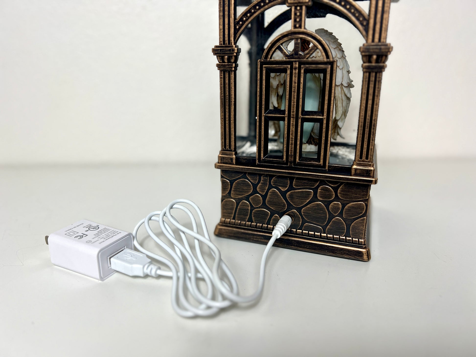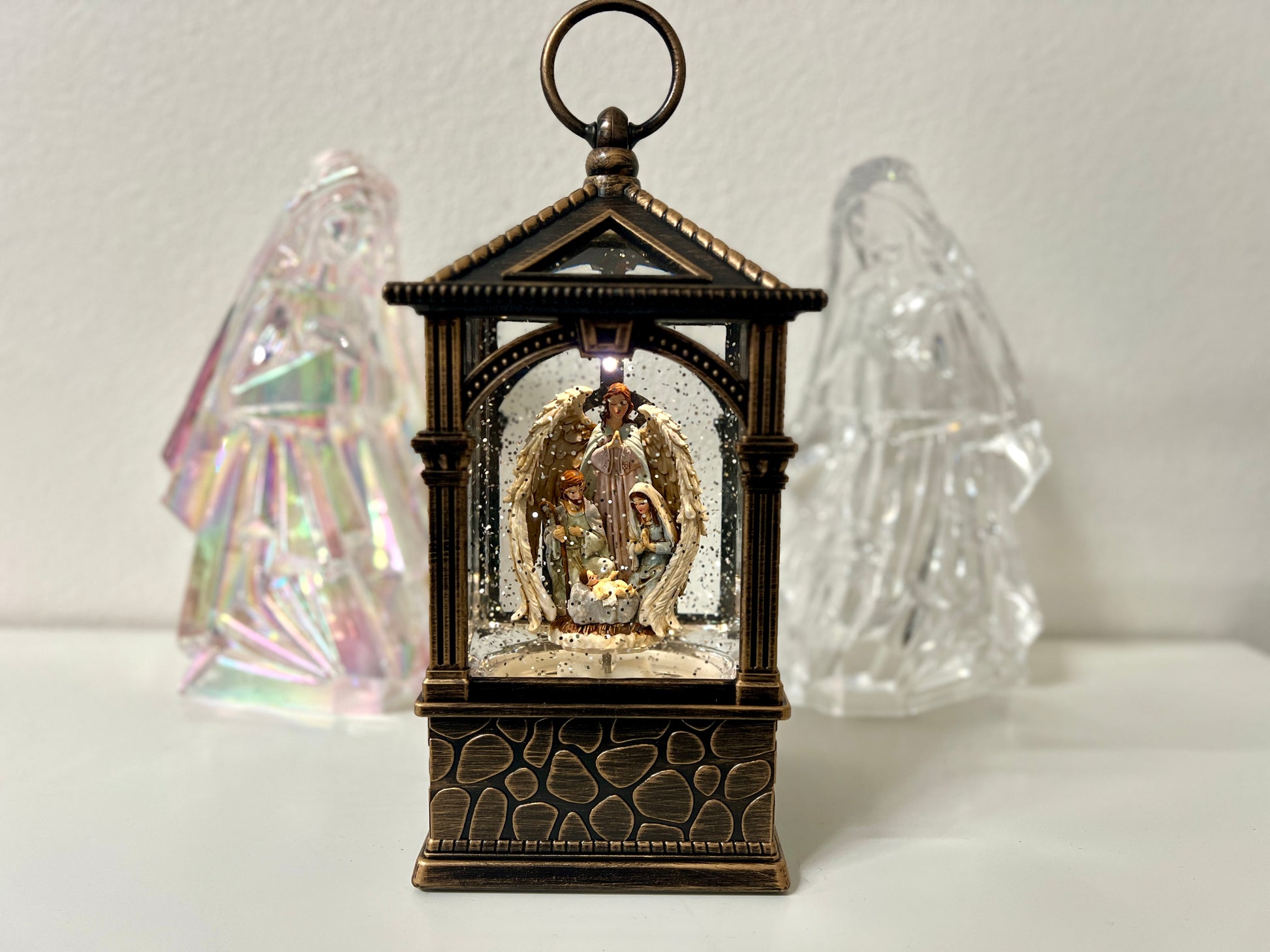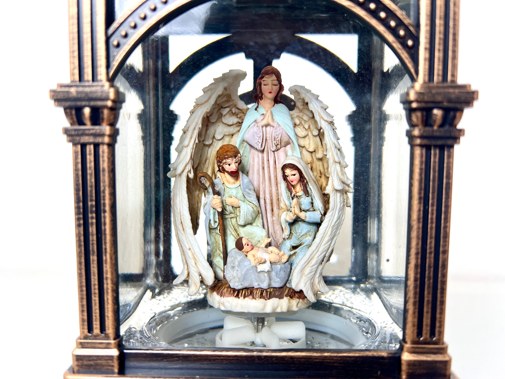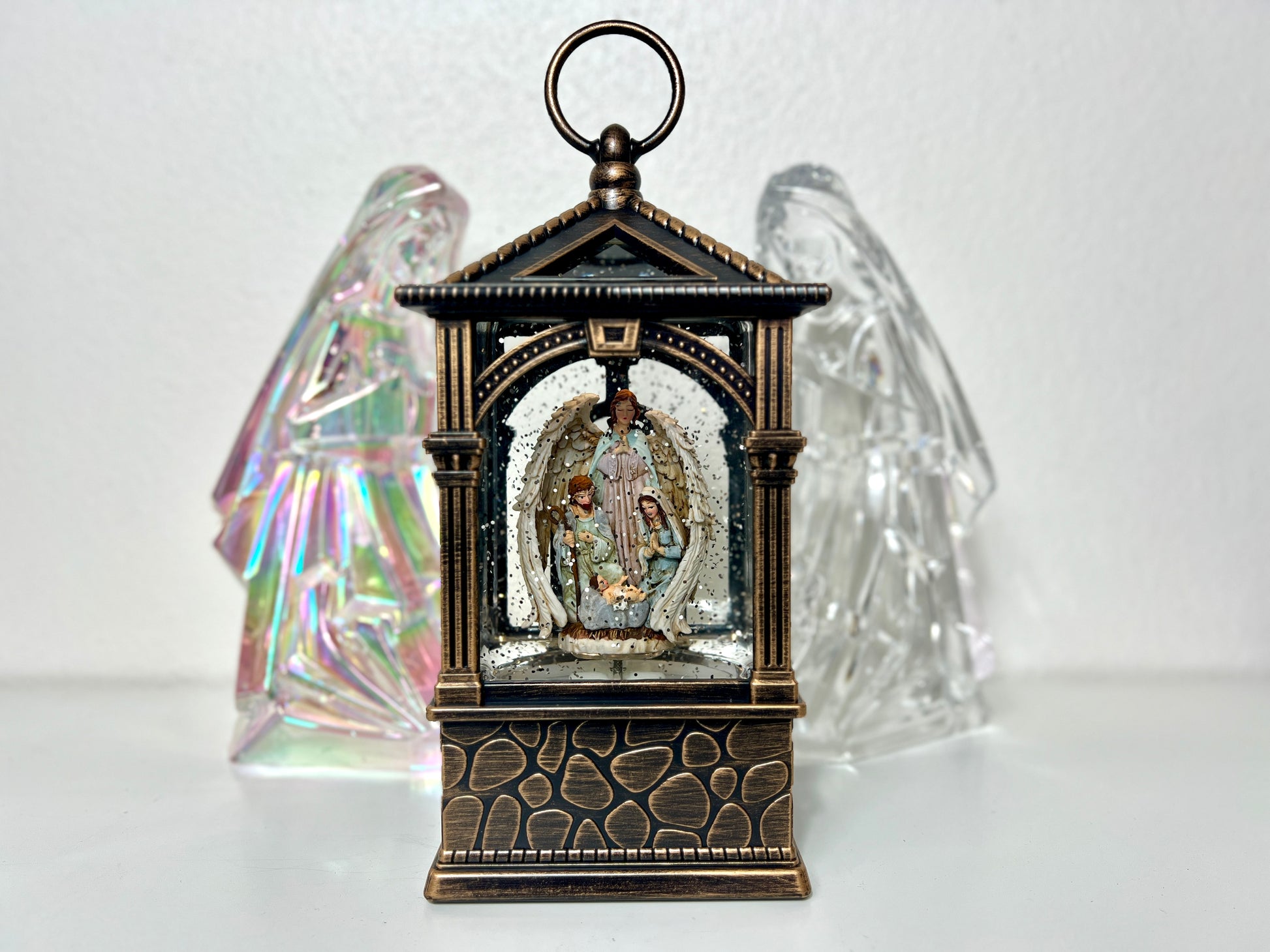 This lighted Nativity water spinner snow globe lantern beautifully captures the sacred moment of the Holy Family beneath the protection of an angel. Surrounded by softly swirling glitter, the scene glows warmly as gentle Christmas music plays in the background, creating a peaceful and reverent holiday atmosphere.