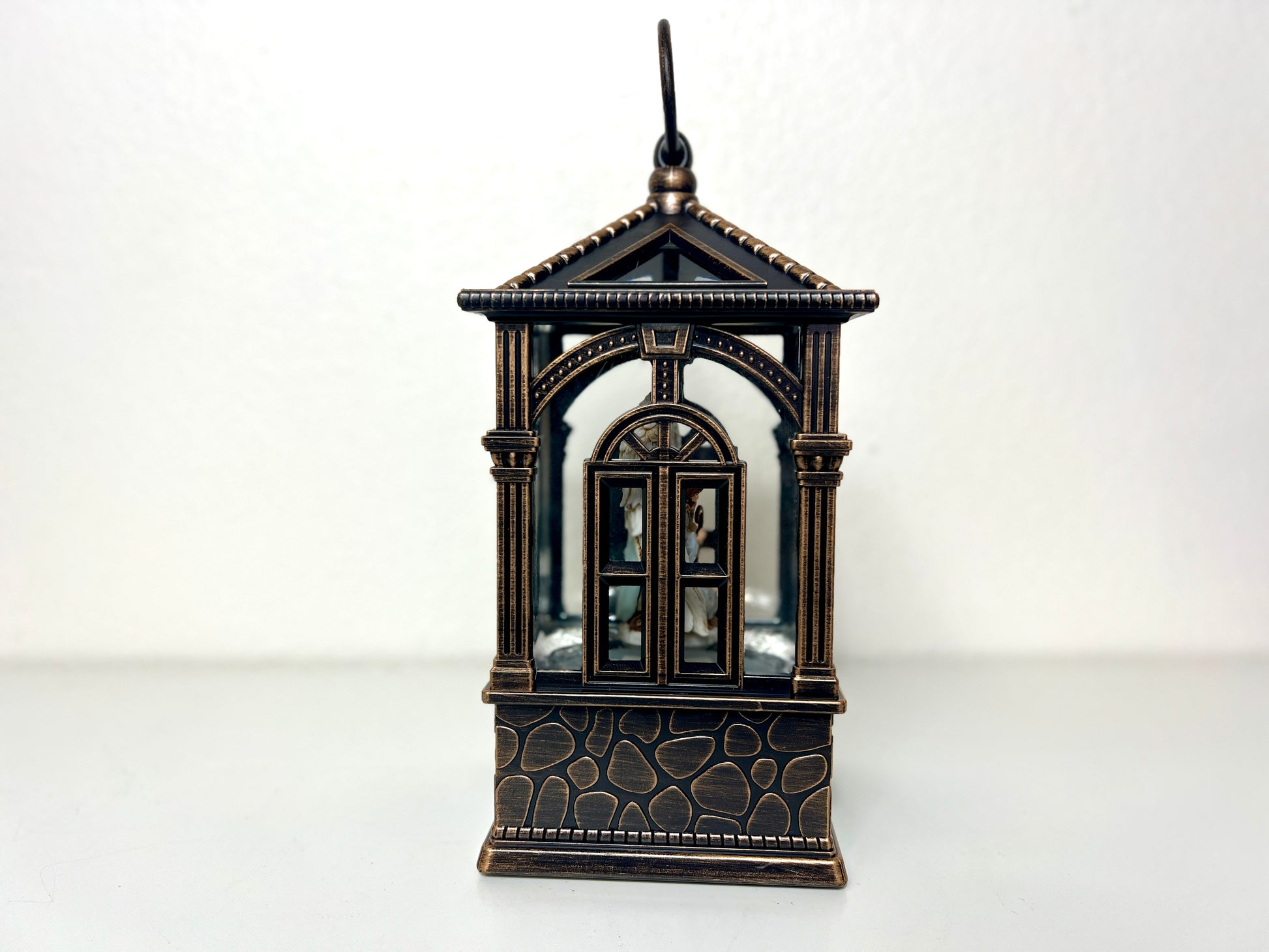 Designed as both a decorative lantern and a meaningful faith-inspired keepsake, this piece is perfect for Christmas displays, mantels, tabletops, or as a heartfelt religious gift. The detailed bronze-style frame and stone-textured base give it a timeless, church-inspired look that complements both traditional and modern dรฉcor.
